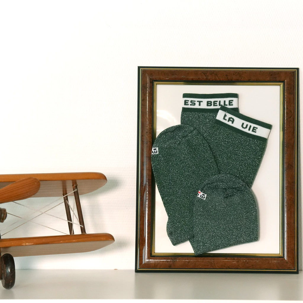 Josette la Belle en verte, c'est la paire de chaussettes en coton bio et lurex, avec pleins de paillettes qui ne grattent pas ! Josette est idéale lors d'une journée de travail, elle vous accompagne aussi danser où vous le souhaitez !